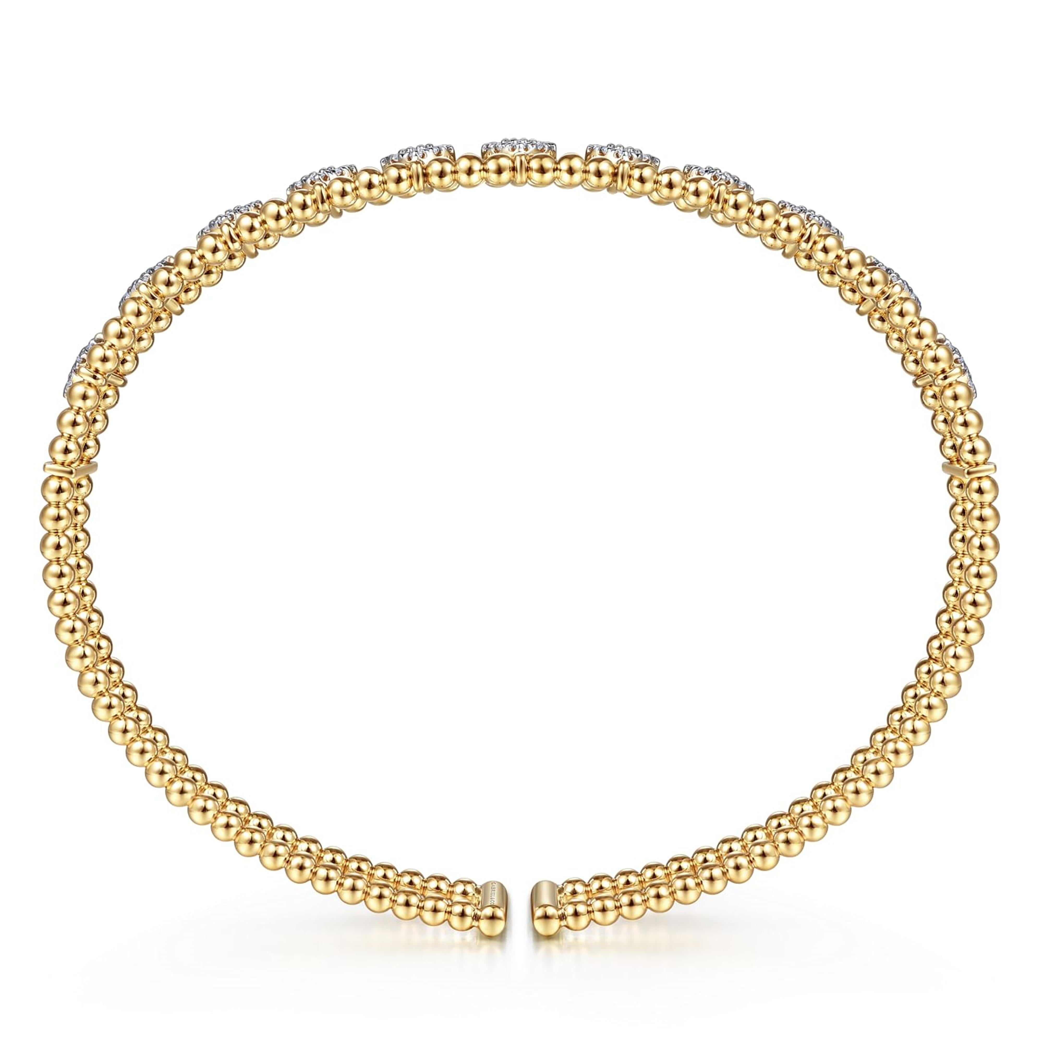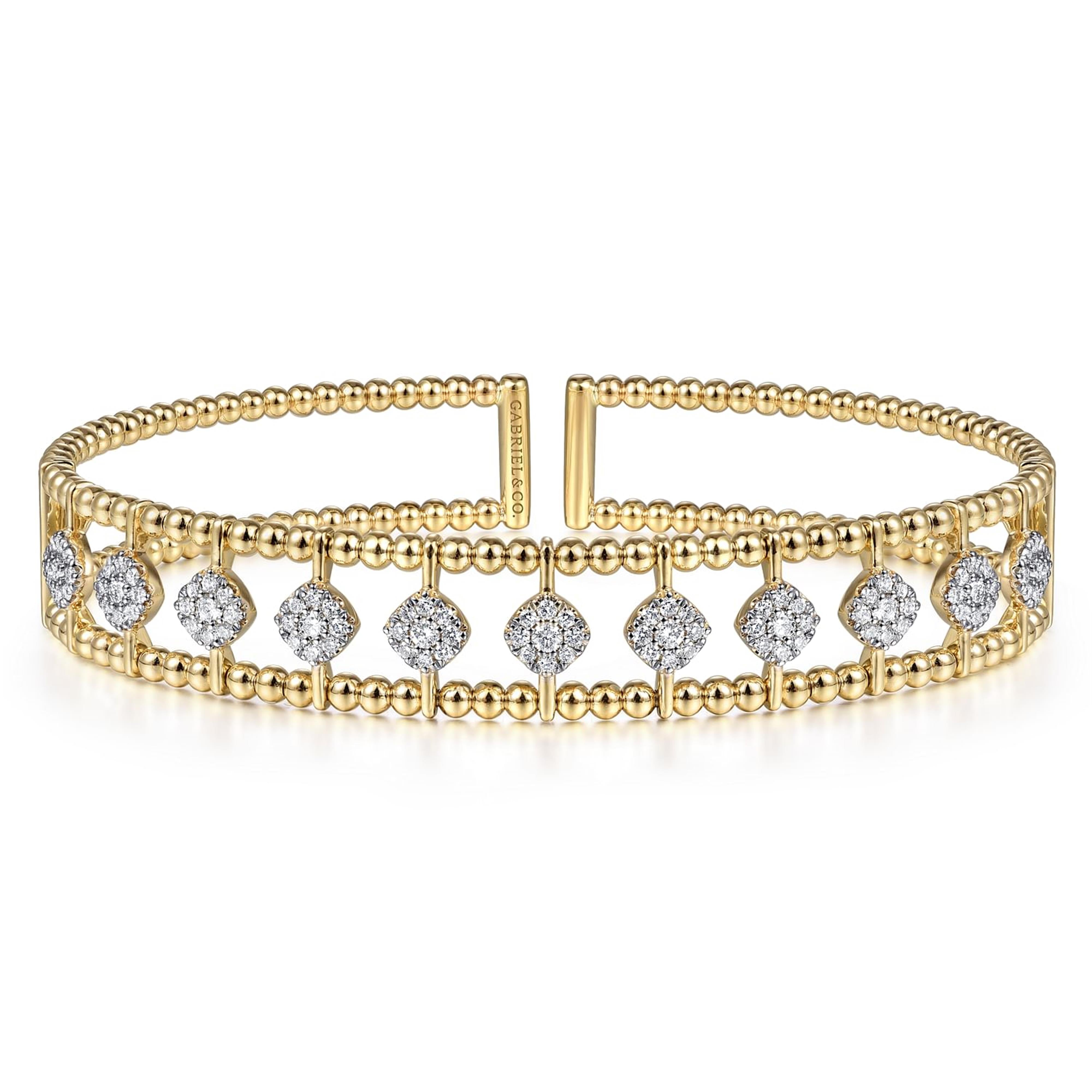 This breathtaking Bujukan Collection cuff bangle bracelet is crafted in 14K yellow gold, showcasing a striking blend of elegance and contemporary design. Featuring 0.71 carats of natural diamonds, this piece is adorned with cushion-shaped diamond clusters set across the open center, creating a dazzling focal point. The bracelet is further enhanced by beaded rows along each edge, adding texture and dimension to its sophisticated design. Measuring 6.5 inches, this cuff is perfect for stacking or wearing alone, making it a luxurious and timeless addition to any fine jewelry collection.