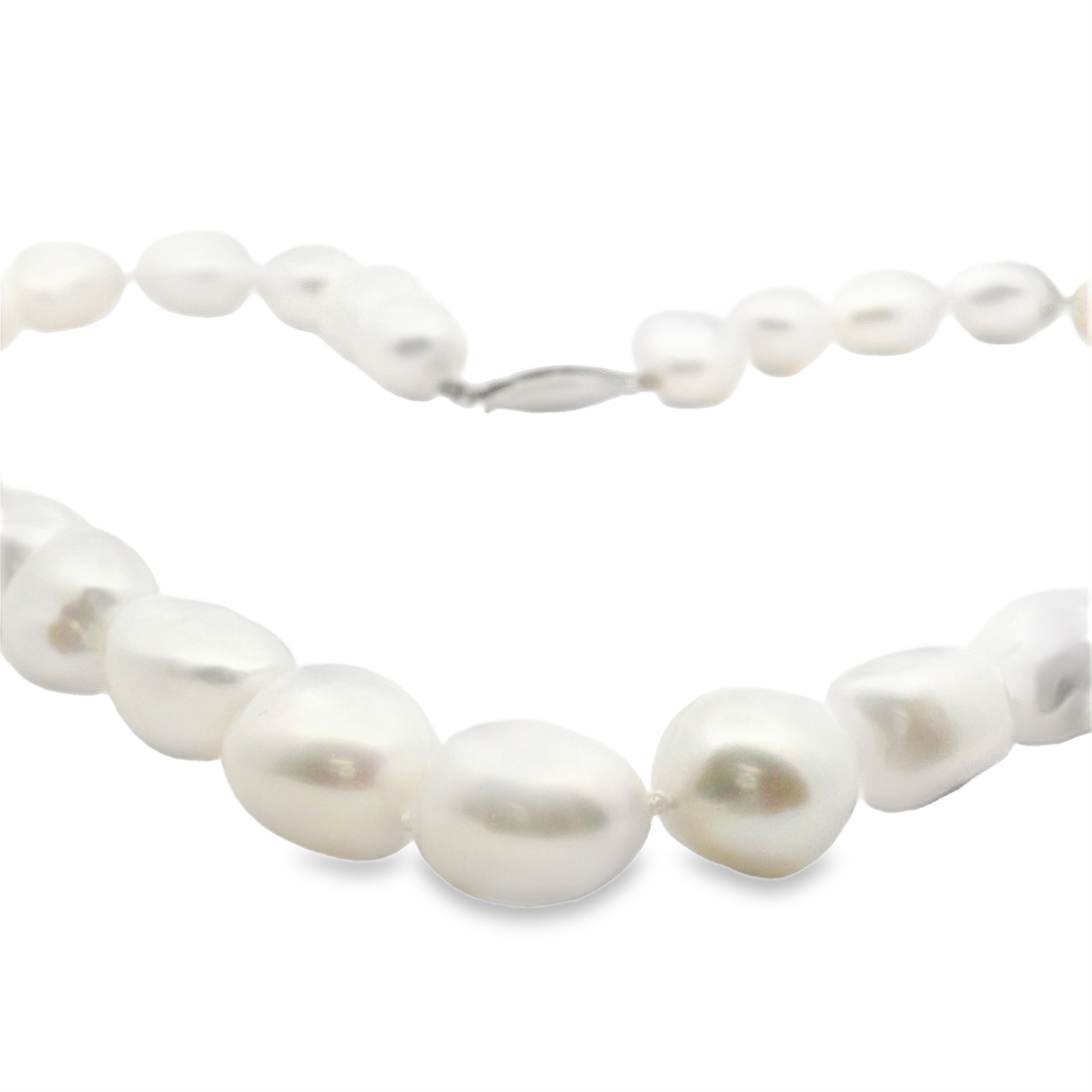 This 16.5" necklace features 29 lustrous freshwater pearls, each measuring 11–12 mm, individually knotted for added elegance and security. The pearls display organic baroque shapes and a soft, natural luster. Finished with a 14k white gold clasp, this strand offers a bold yet classic statement.