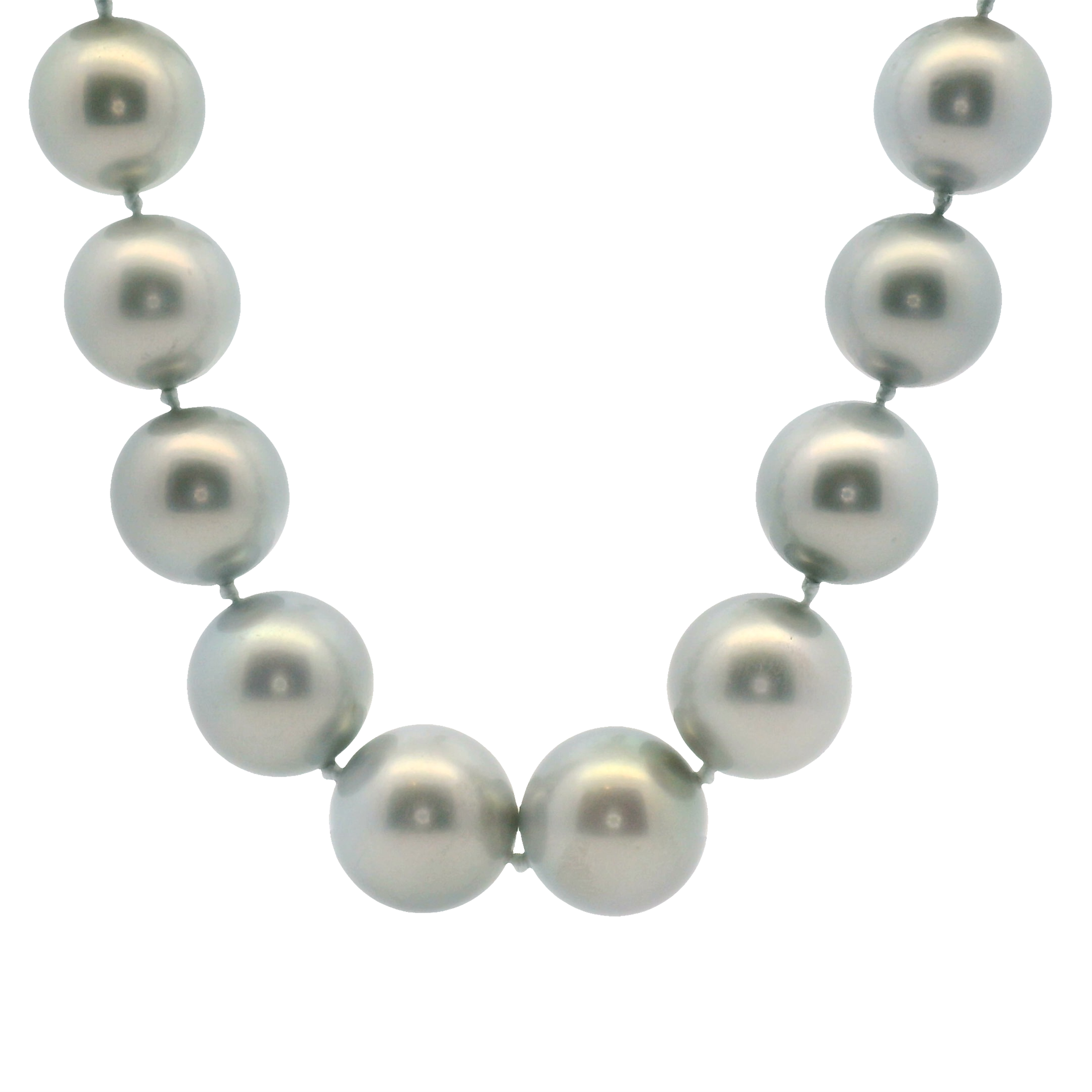 This elegant 18" necklace features 37 silver-hued Tahitian pearls, each measuring between 10–13 mm and individually hand-knotted for a classic finish. The pearls exhibit a smooth, near-round shape and striking luster. Secured with an 18k white gold clasp, this strand is a refined statement of natural beauty and luxury.