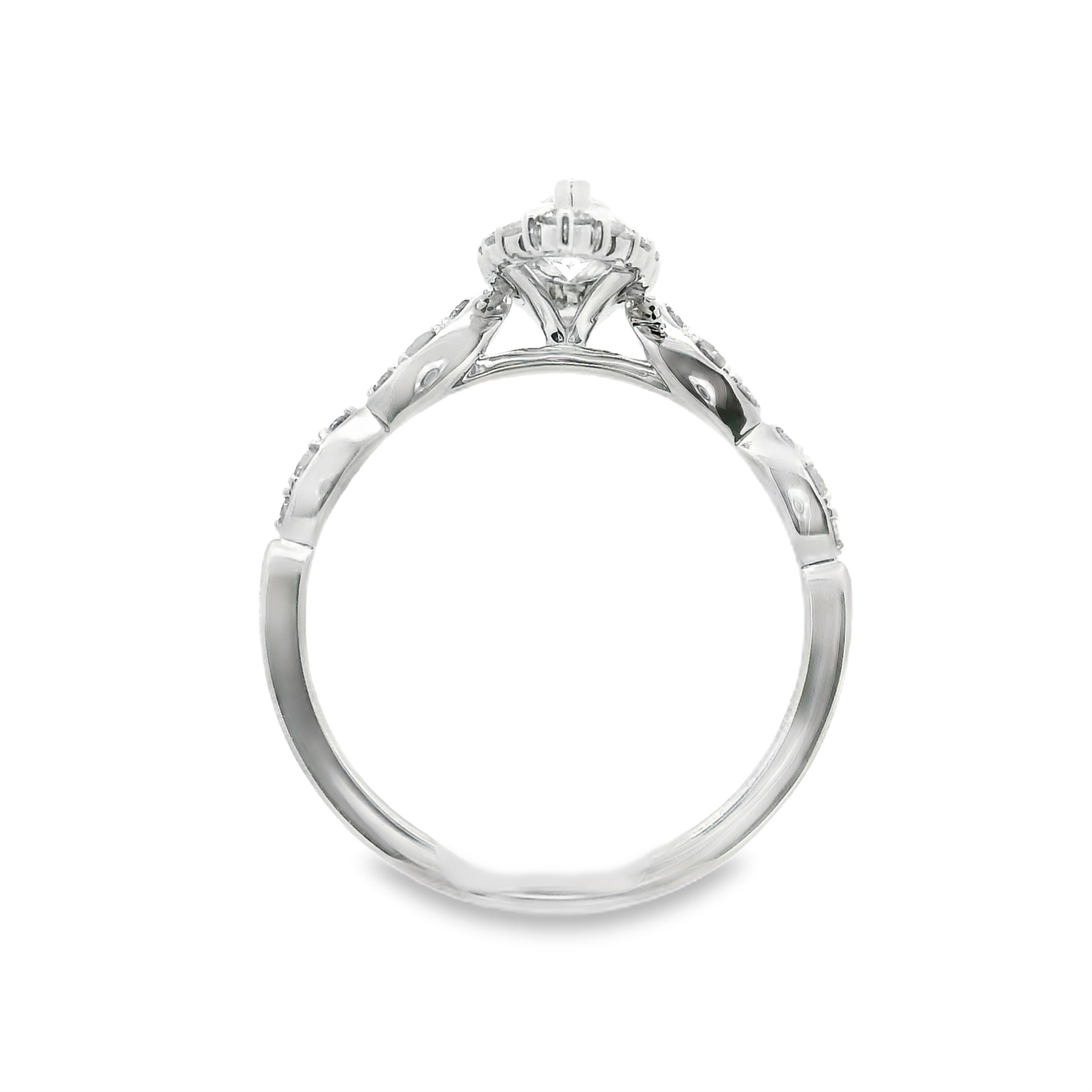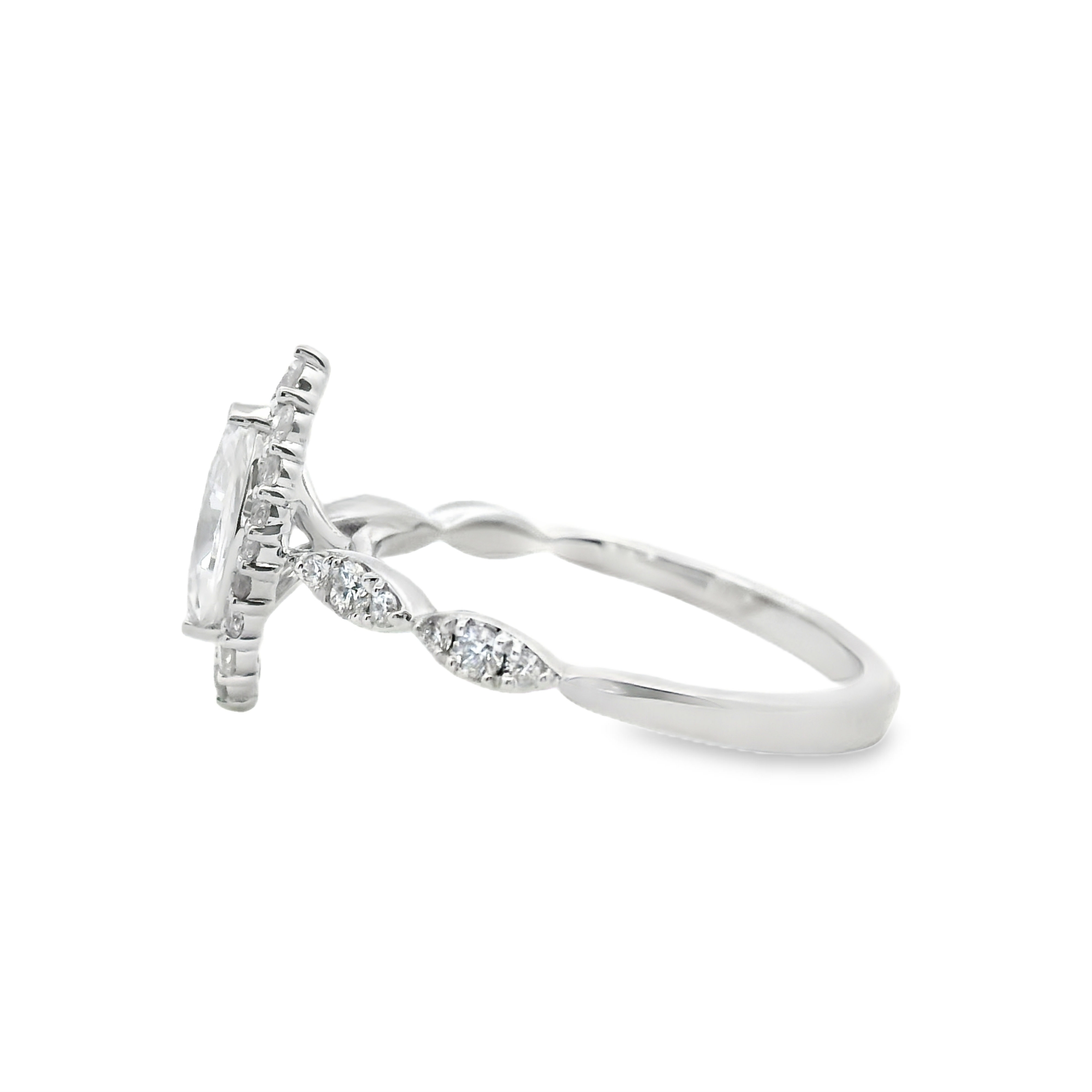 This 14k white gold engagement ring features a marquise-cut center stone framed by a halo of round natural diamonds. Additional round diamonds are set along the band in alternating marquise-shaped stations, adding soft dimension and extra sparkle throughout the design, totalling 0.34 carats.