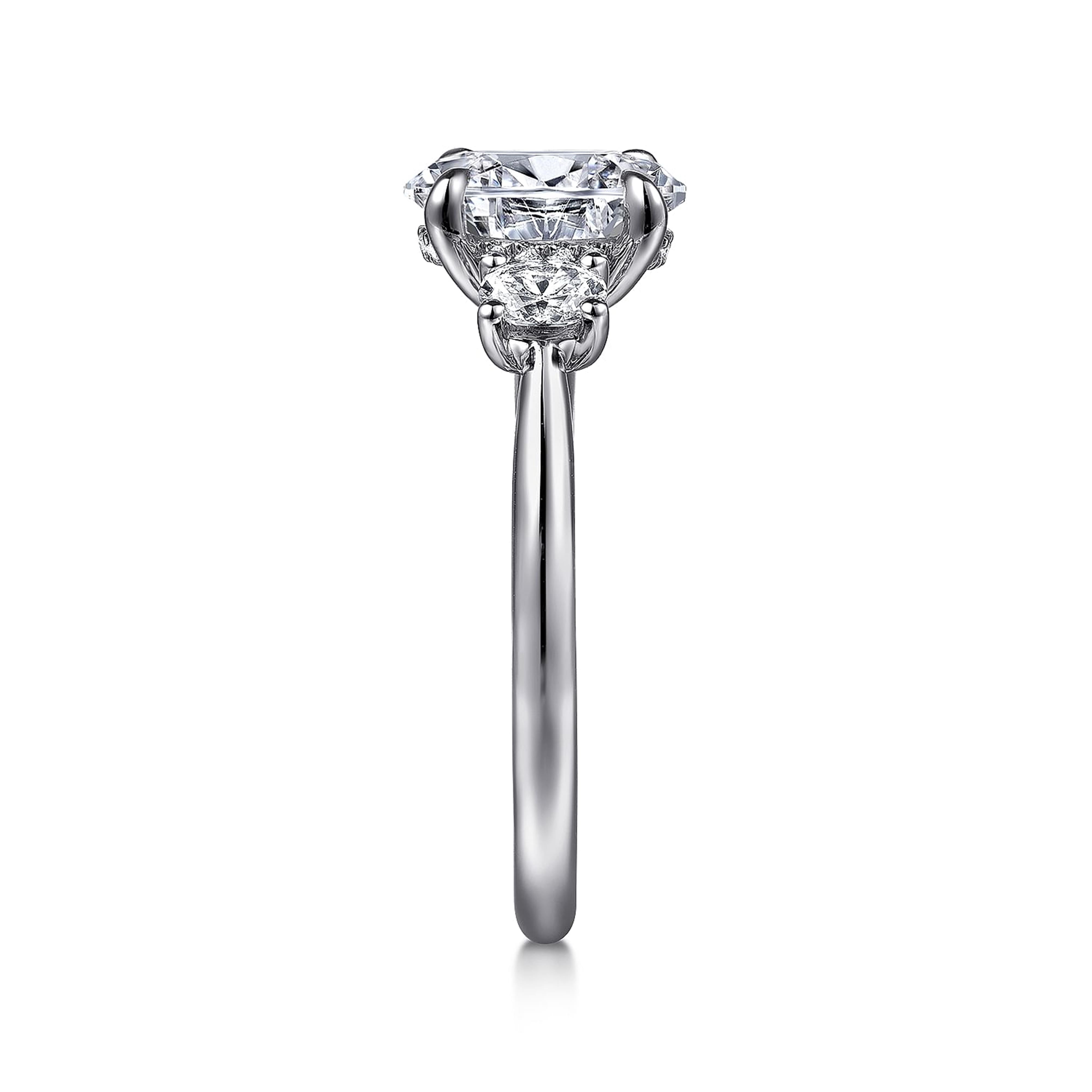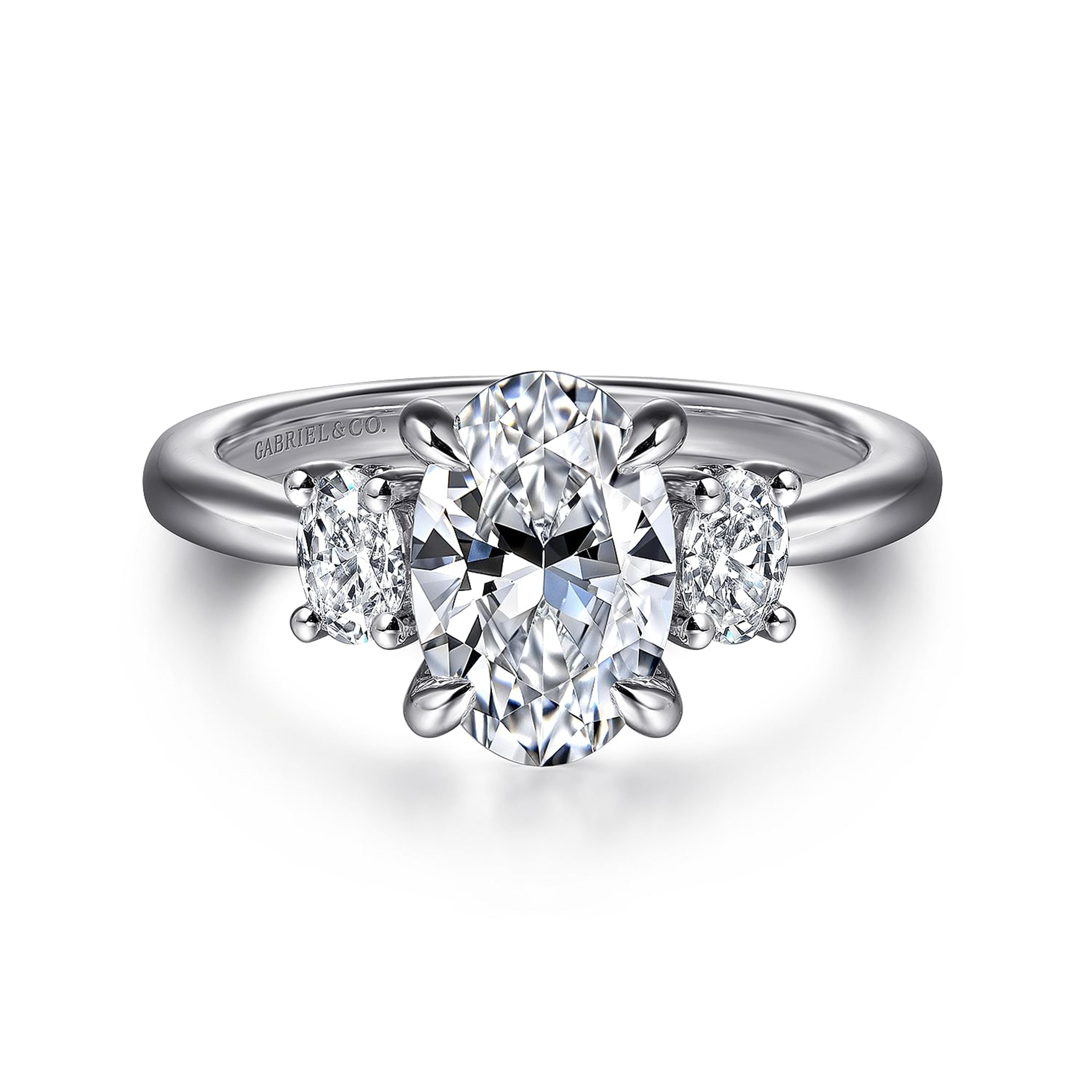 Refresh availabilityThis sophisticated 14k white gold engagement ring features an oval-cut center diamond* flanked by two smaller oval natural diamonds, creating a classic three-stone silhouette. Together with additional hidden round diamonds nestled beneath the center setting, the side stones total approximately 0.36 carats.