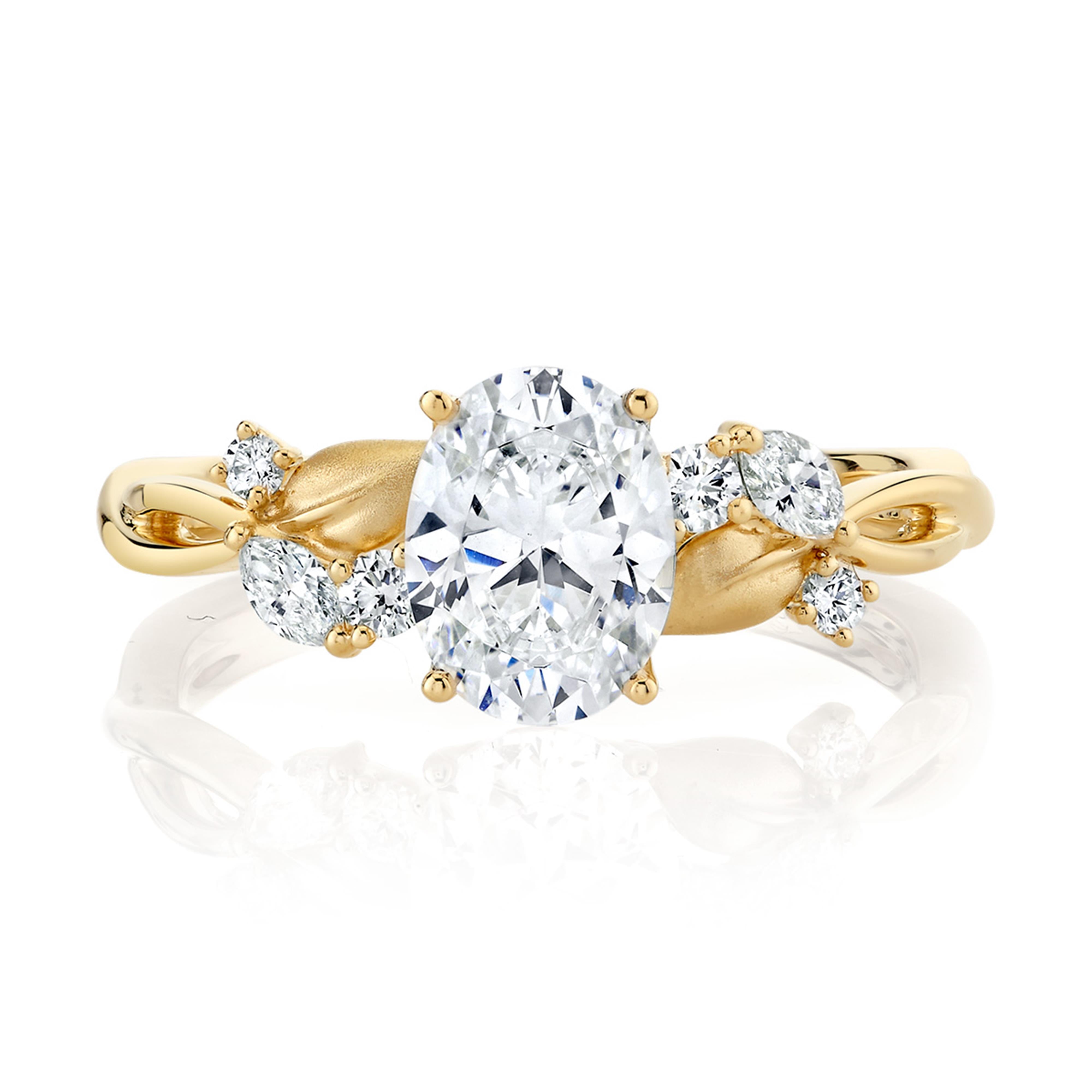 From our Lyria Collection, this 14k yellow gold engagement ring features an oval center stone* accented by 0.20 carats of marquise and round natural diamonds. Sculpted leaf-inspired shoulders add signature Lyria detailing and a soft organic look.
