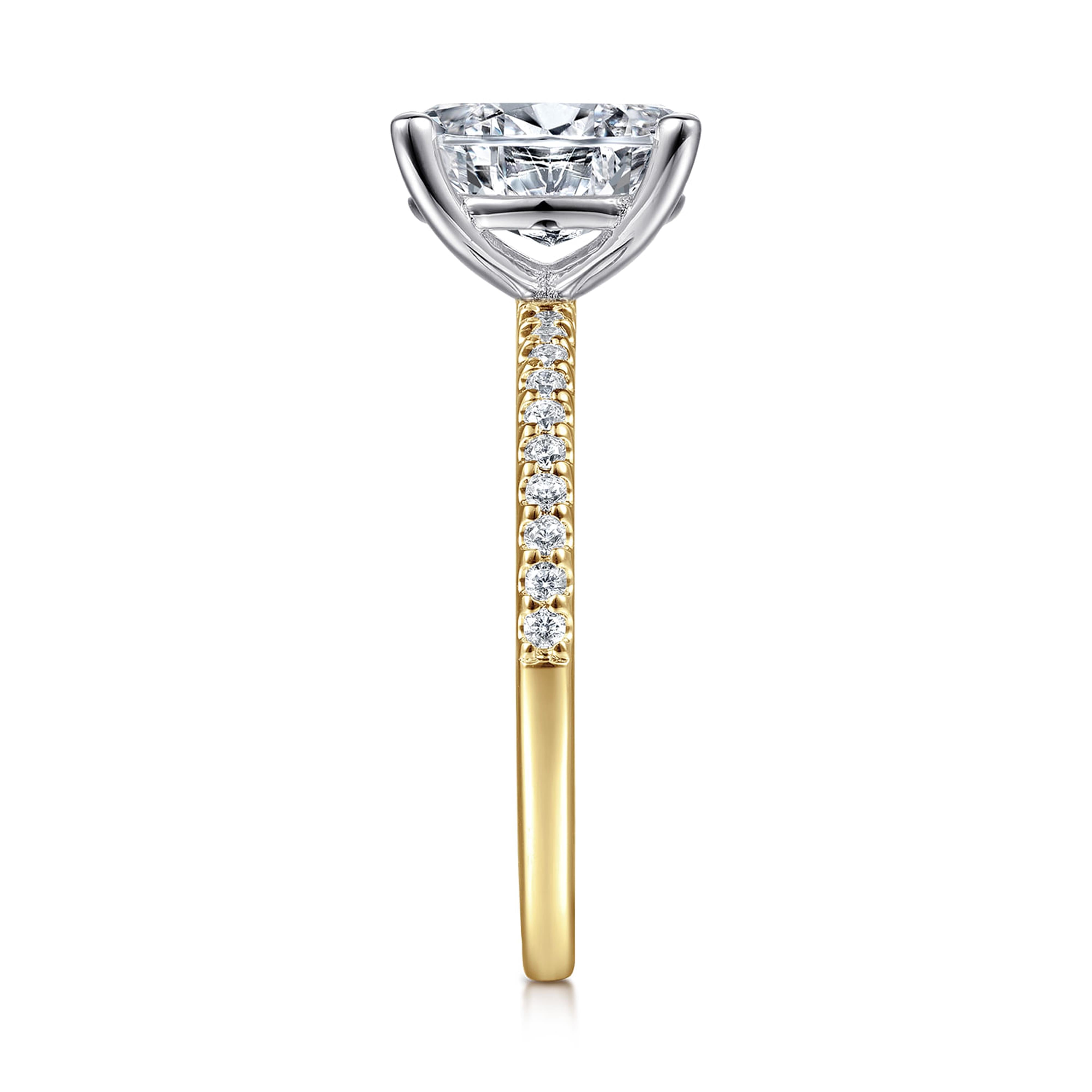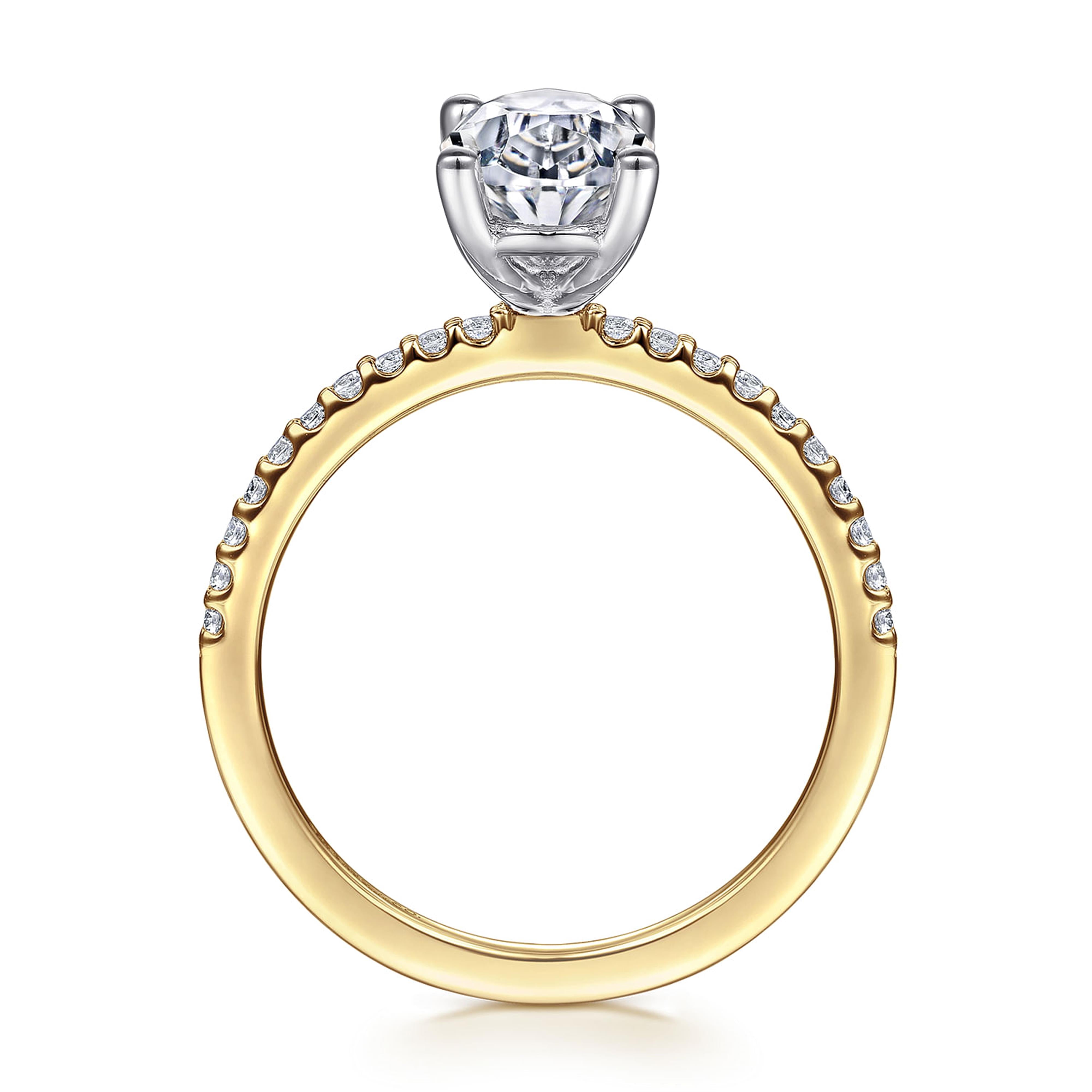 This elegant engagement ring showcases a brilliant oval center stone* secured in a classic four-prong white gold setting. The band, crafted in warm 14k yellow gold, is adorned with 0.15 carats of round natural diamonds in a sparkling pavé design.