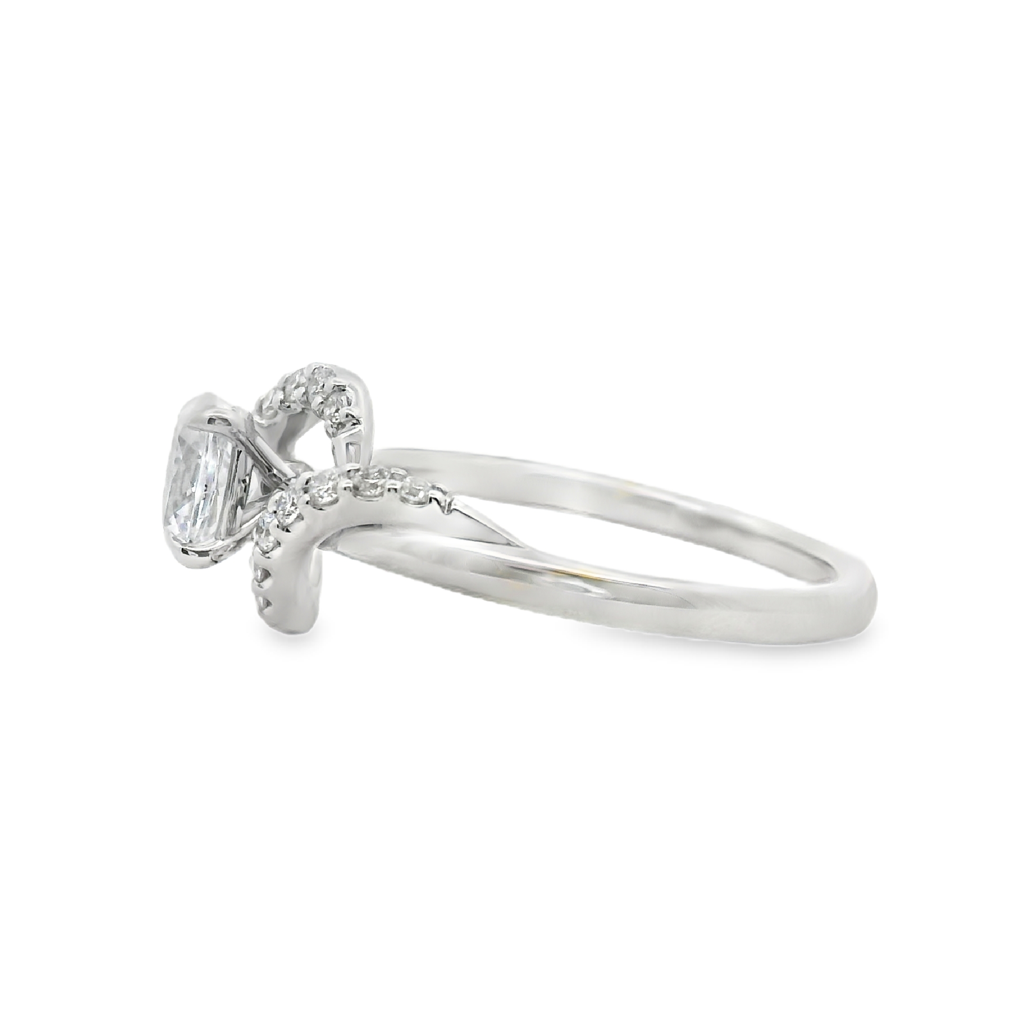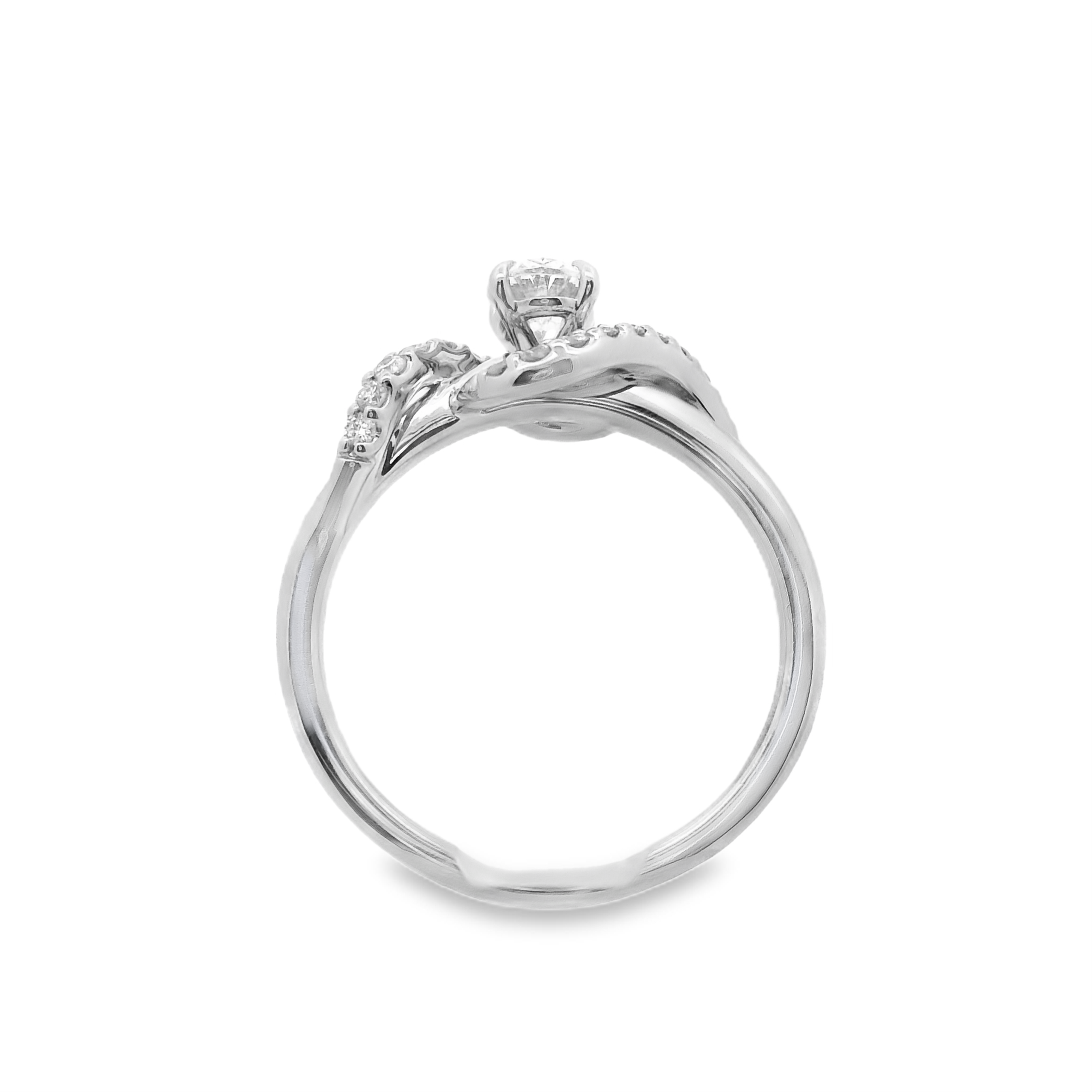 This 14k white gold engagement ring features an oval center stone* wrapped in a soft twisting band set with 0.15 carats of round natural diamonds. The curved silhouette adds movement and sparkle while keeping a clean, modern profile.