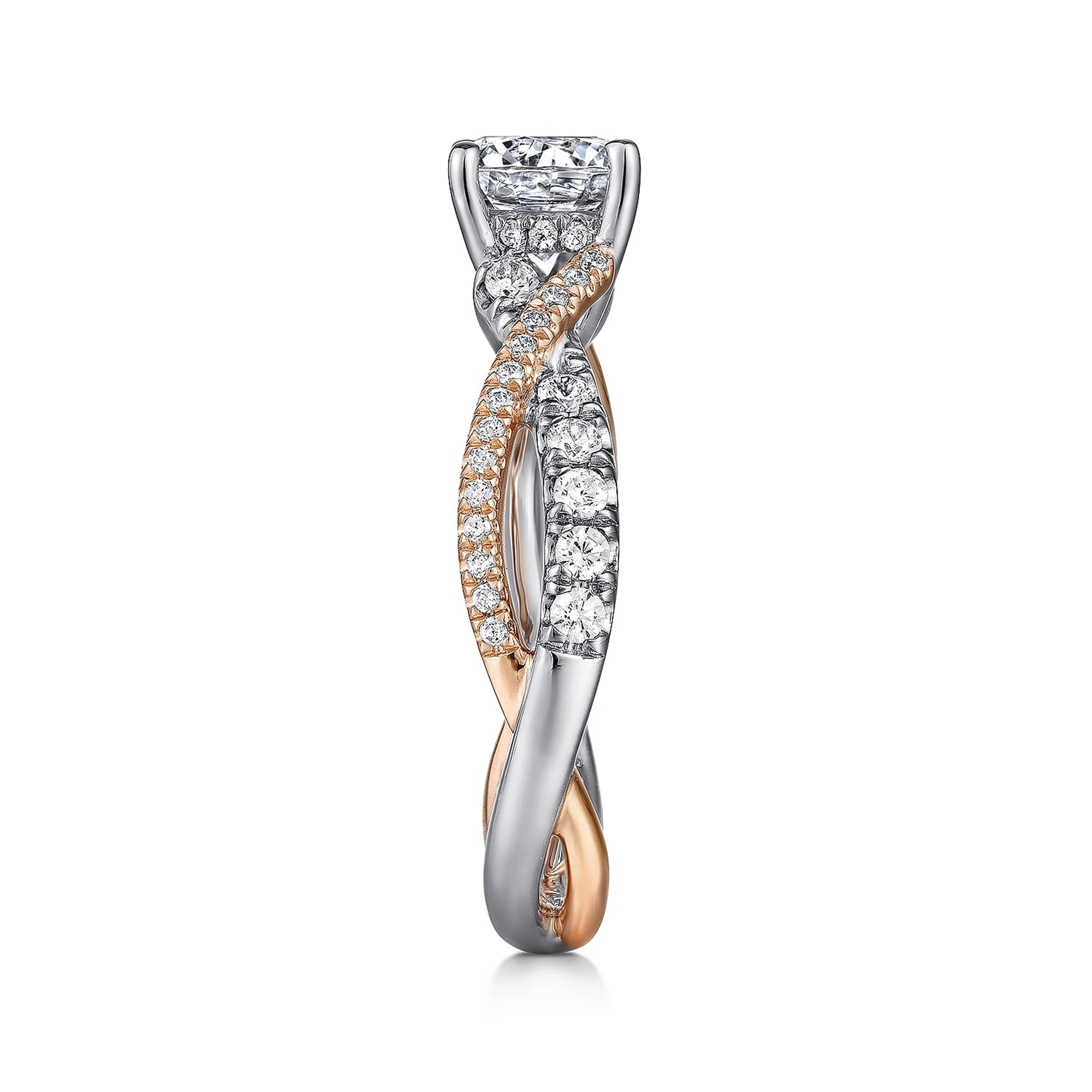 Refresh availabilityThis captivating 14k white and rose gold engagement ring features a round center diamond* in a secure four-prong setting. The band showcases a striking two-tone design, where polished white gold and warm rose gold strands intertwine in a graceful, twisted silhouette. Accentuating the romantic movement of the design are 0.42 carats of round natural diamonds, pavé-set along each strand and in a hidden halo for maximum brilliance.