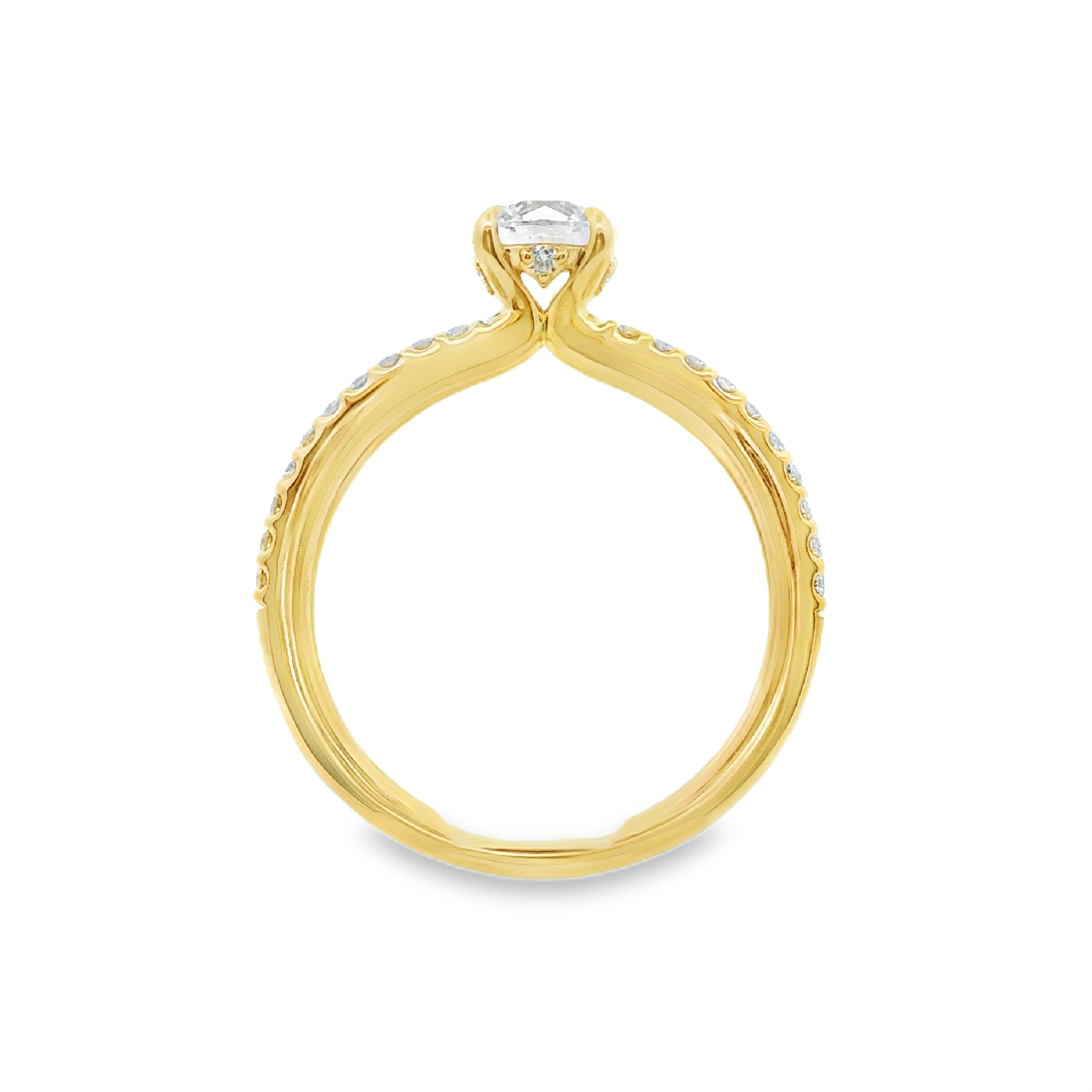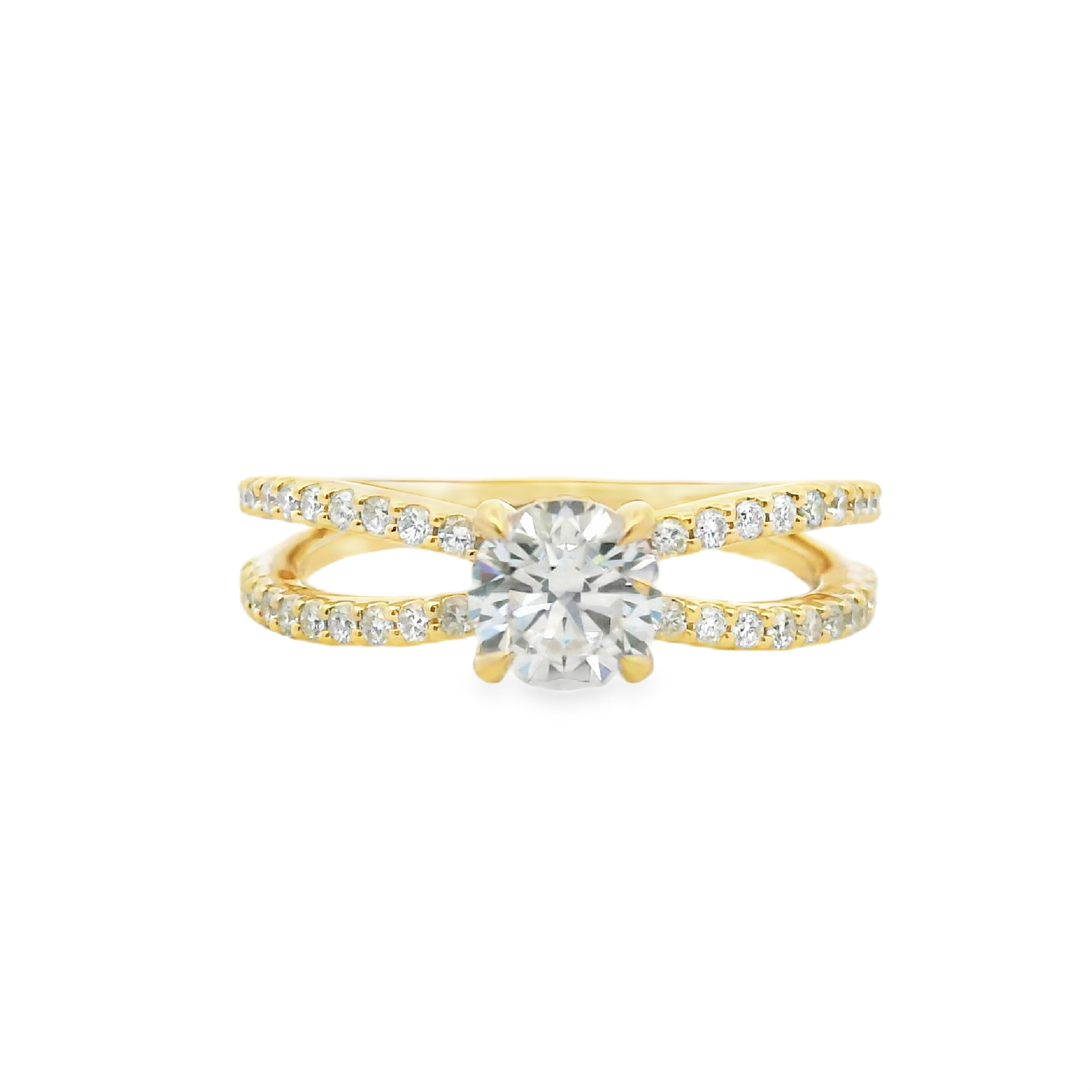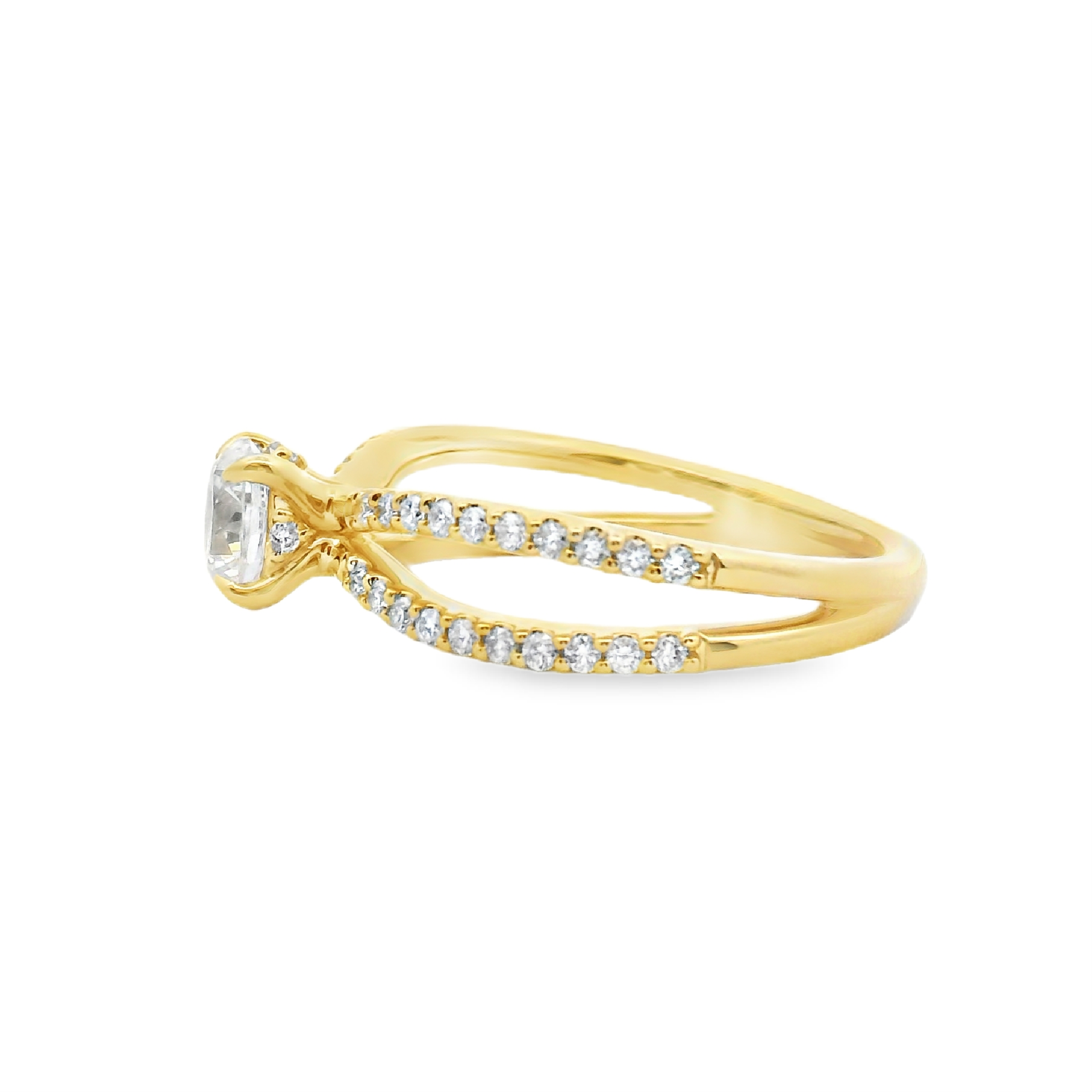 This 14k yellow gold engagement ring features a round center* set between split shoulders lined with 0.25 carats of round natural diamonds. The polished band and open crossover design give the ring a modern, airy profile while maintaining classic sparkle.